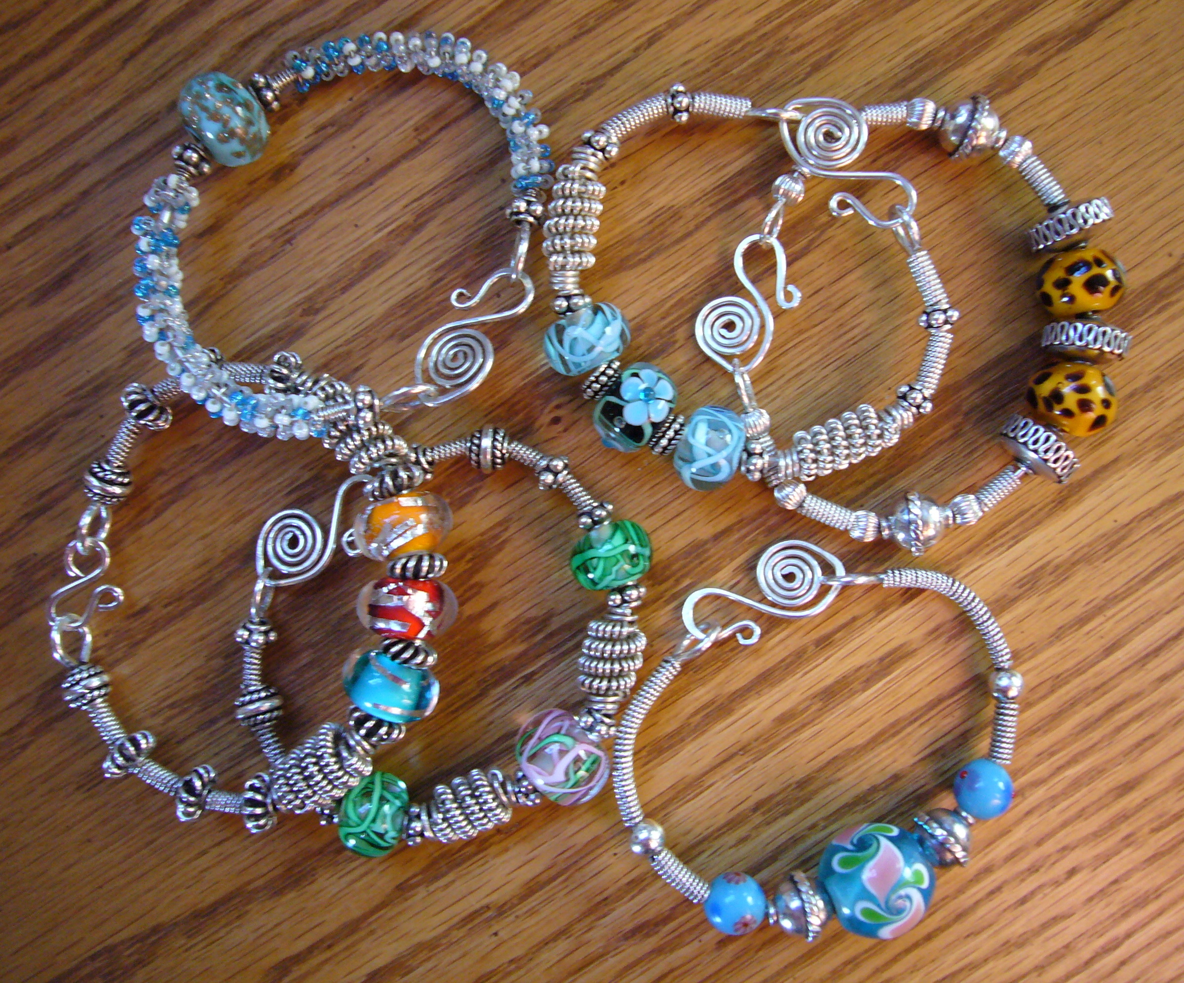 I have a collection of bead and wire bangle bracelets that I made a few years ago.  I spend so much time quilting that I just don’t find time to work with my beads anymore.  These bracelets were sitting in my jewelry box just waiting for me to pick them up and start wearing them again.