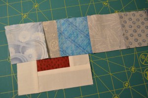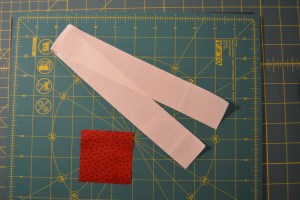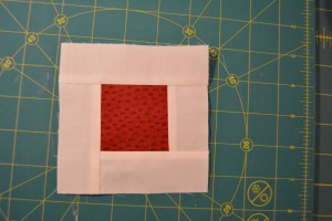 You will also need a 2 1/2″ square block for the center and a strip of fabric that is 1 1/2″ wide and about 18″ long for the center square sashing.