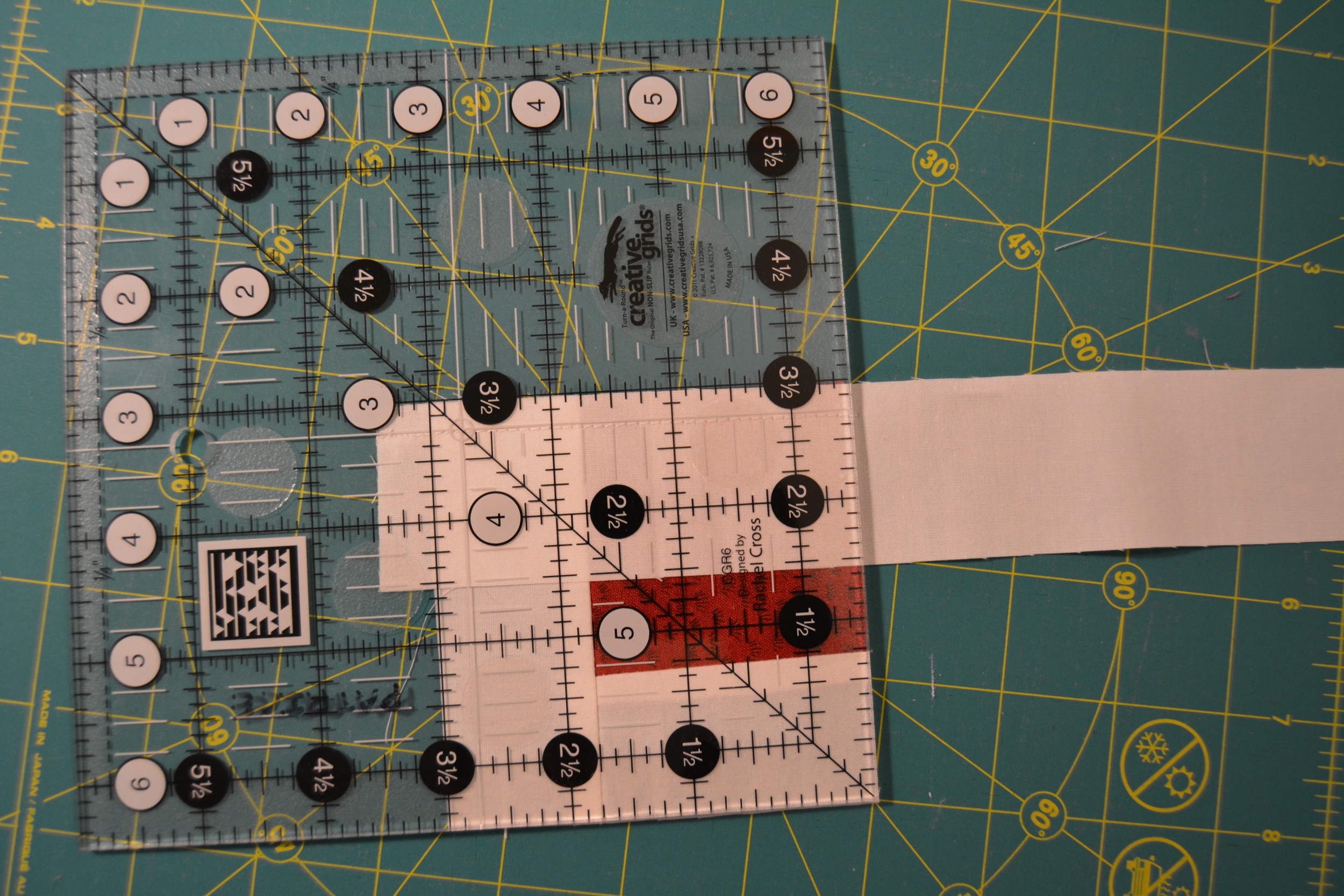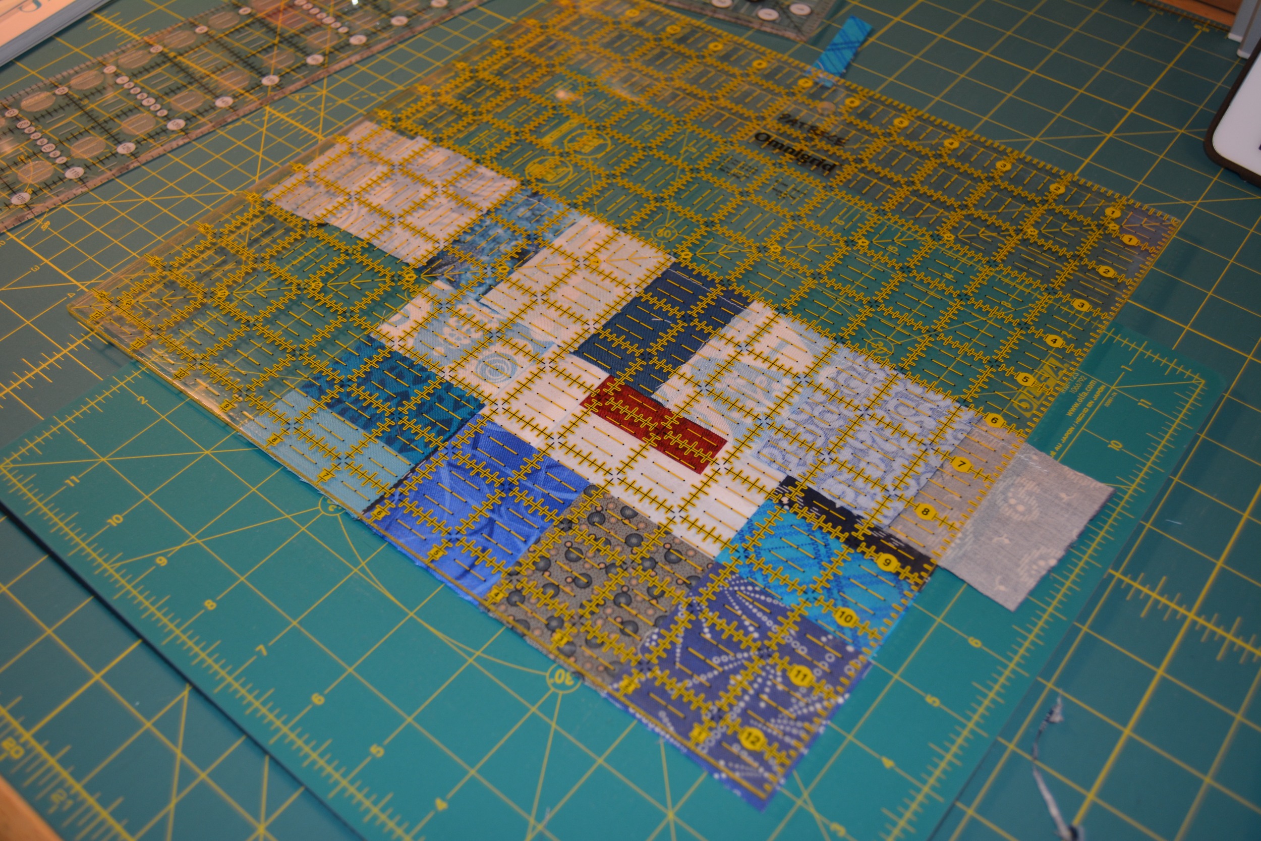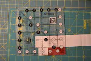 When the block gets to 8 1/2″ wide you will want to trim with a 12 1/2″ square ruler.