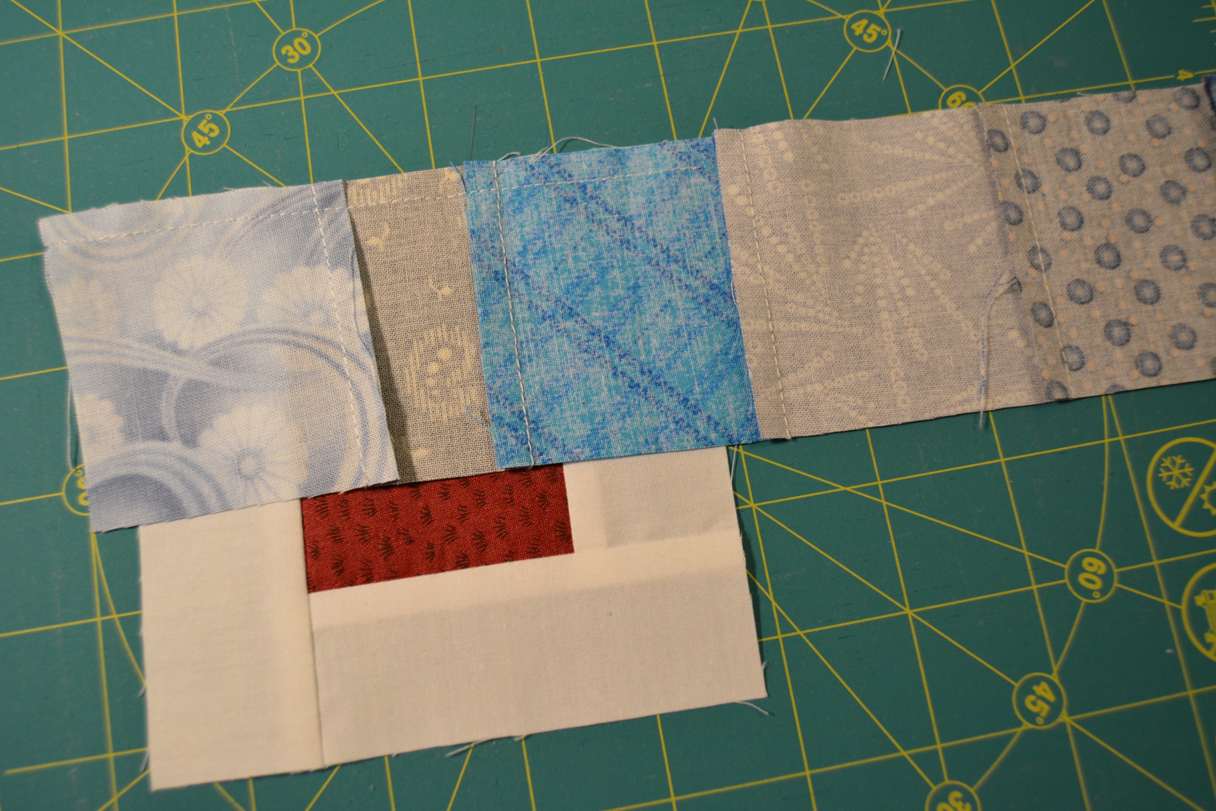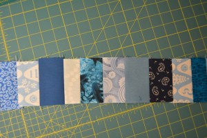 For this block you will need scraps of fabric that are each about 3 1/2″ on one side and various sizes on the other that are between 1 1/2″ and 2 1/2″ (a little larger or smaller is fine). You will need enough so that when sewn together you will have a strip that is at least 26″ long and about 3 1/2″ wide.