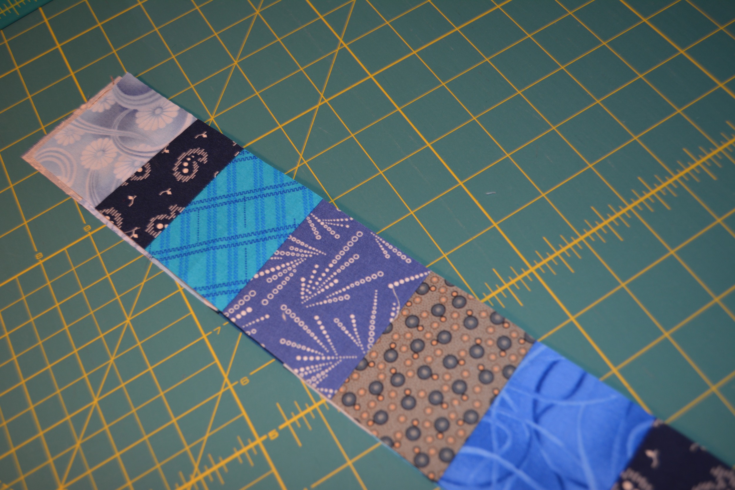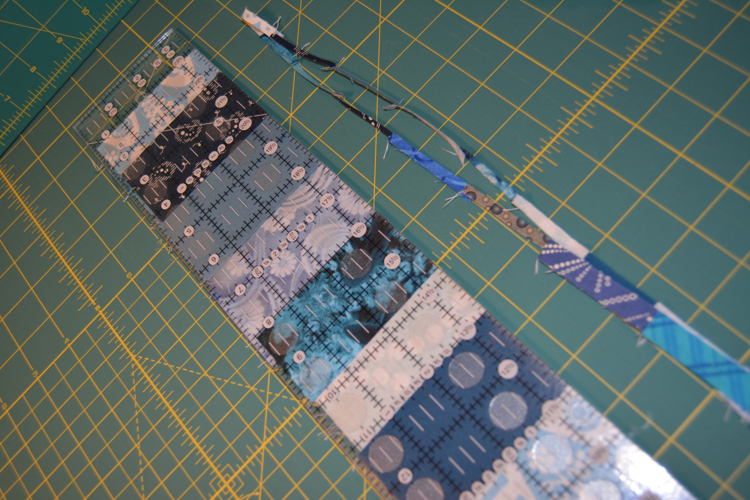 Sew the scraps together along the 3 1/2″ edge. Continue piecing until the strip is at least 26″ long. Then trim each side so that the finished strip is exactly 2 1/2″ wide.