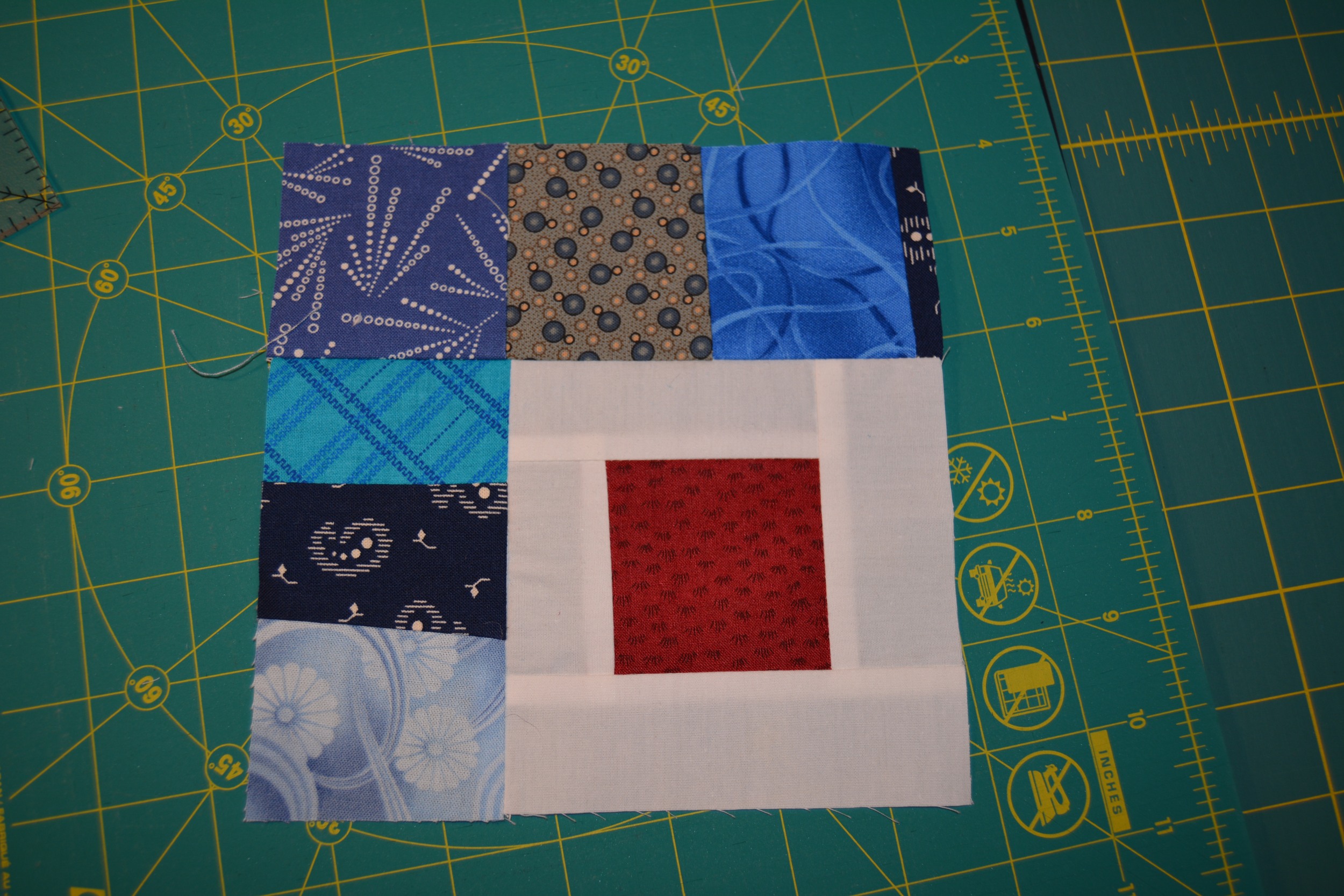 The sashed center square will be a 4 1/2″ square. Next, sew the scrappy border to this block with the same approach used for the sashing. I started on the same side where I started with the sashing.
