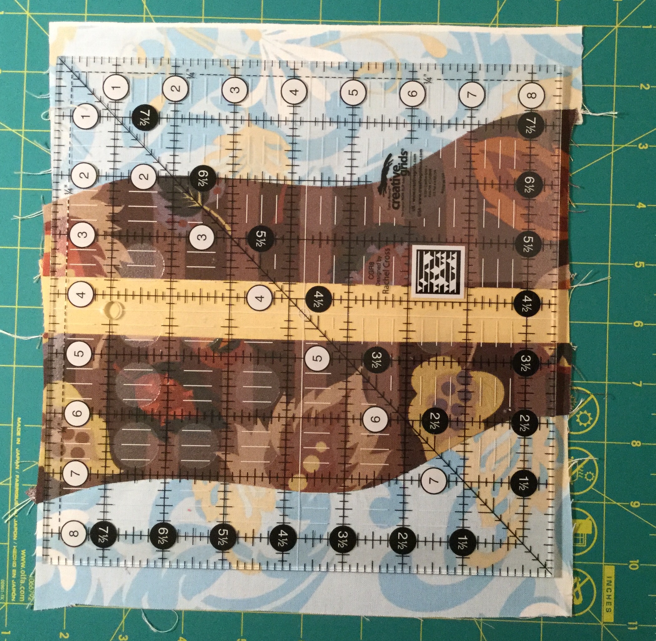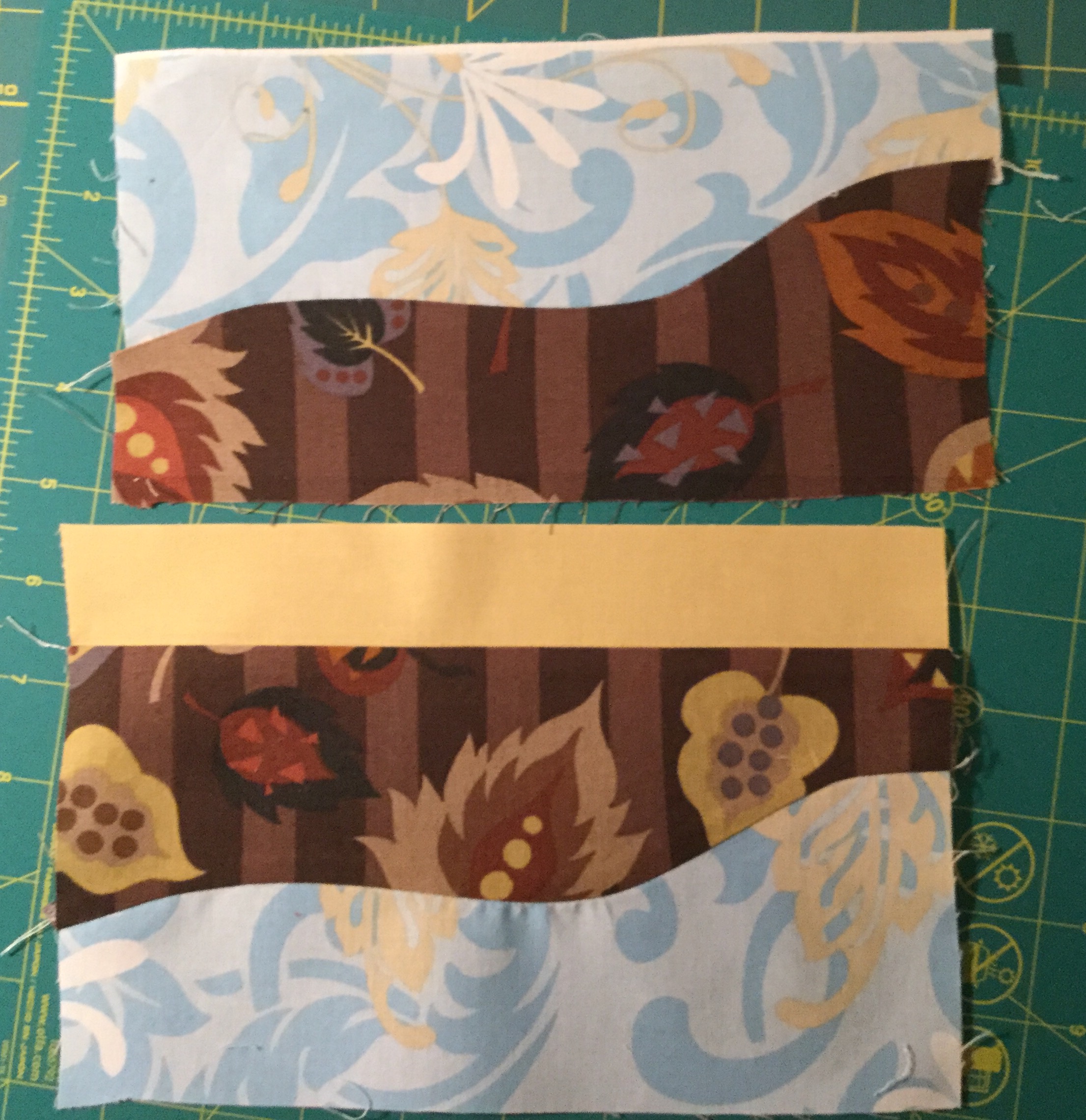 To finish the block cut a strip of fabric that is 9″ x 1.5″ or 9″ x 2″. Sew this strip to a long edge of one of the curved sections and then to a long edge on the other one. You decide which edges to have in the middle. I used the same fabric on either side of the strip. Then trim your block, keeping in mind that you will want the curves to stay inside the 1/4″ seam lines.