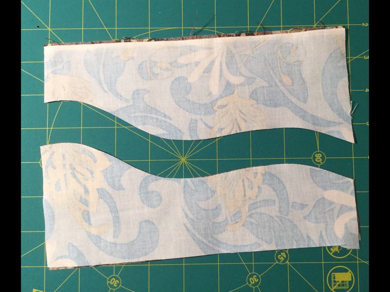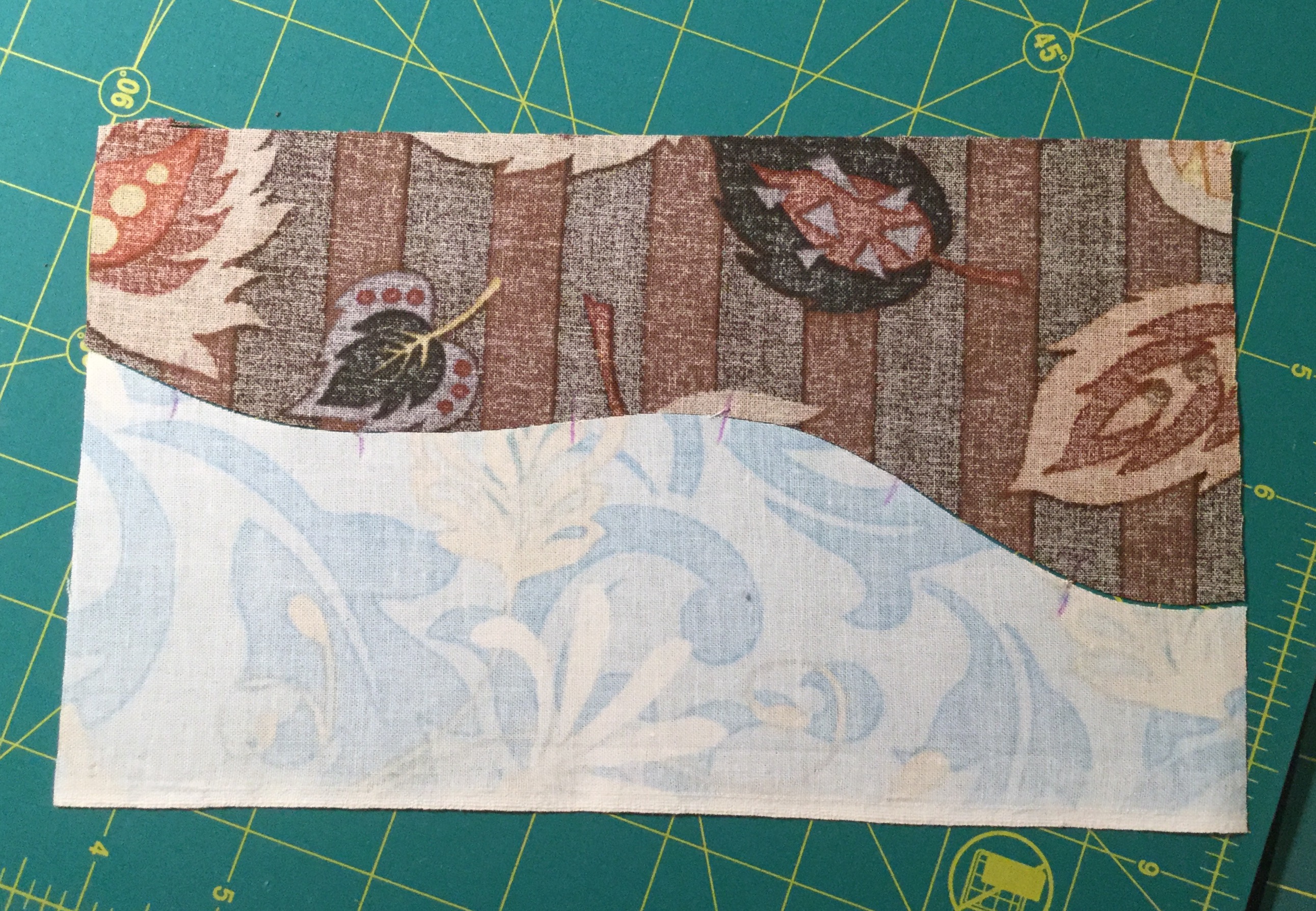 Now you can cut your curve. If you have a rotary cutter with a smaller blade use that. The smaller the better. I received a cutter specifically for cutting curves as a gift and so I am using that. If you are trying curved piecing for the first time just cut a gentle curve. The tighter the curve the more difficult it will be to sew with the machine.