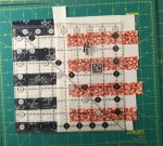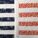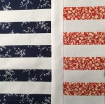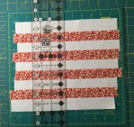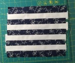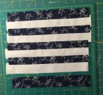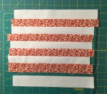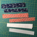 Cut 4 pieces that are 1.5″ x 10″ of one fabric, cut 5 pieces that are 1.5″ x 10″ of another fabric, cut 11 pieces that are 1.5″ x 10″ of a background fabric.