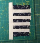 Sew a background strip to the edge of one of the four sections, again perpendicular to the strips. Sew a section of the other fabric to the other side of the background fabric. You might want to carefully line up the two sections so that the background and non-backgrounds are alternating on either side of the center strip. Or you might not!