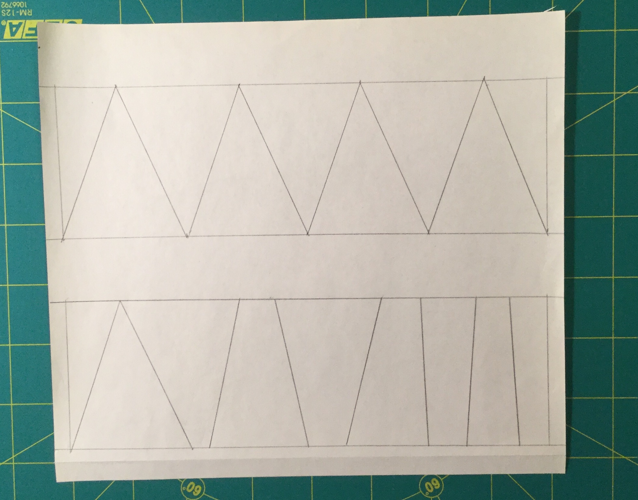 For a precise block start with two horizontal lines that are parallel and 2.5″ apart. Draw your seam lines 1/4″ from the edges of the paper. Then measure and mark the horizontal lines every 2″s. Start the marks at 1″ in from the seam line on one horizontal line and 2″ on the other to offset them. Then draw lines connecting these marks from one horizontal line to the other to make triangle sections.