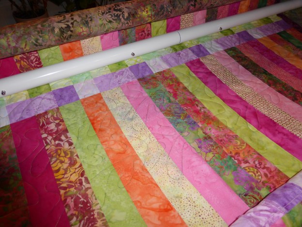 The fabric is a Hoffman Watermelon Bali Pops pack of 2 1/2 inch strips with two light green and two lavender fabrics substituted. Sorry to say that this color set has been “retired” and I could not find it even on e-bay. Perhaps Wildberry or Splash will make you just as happy!