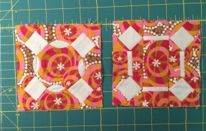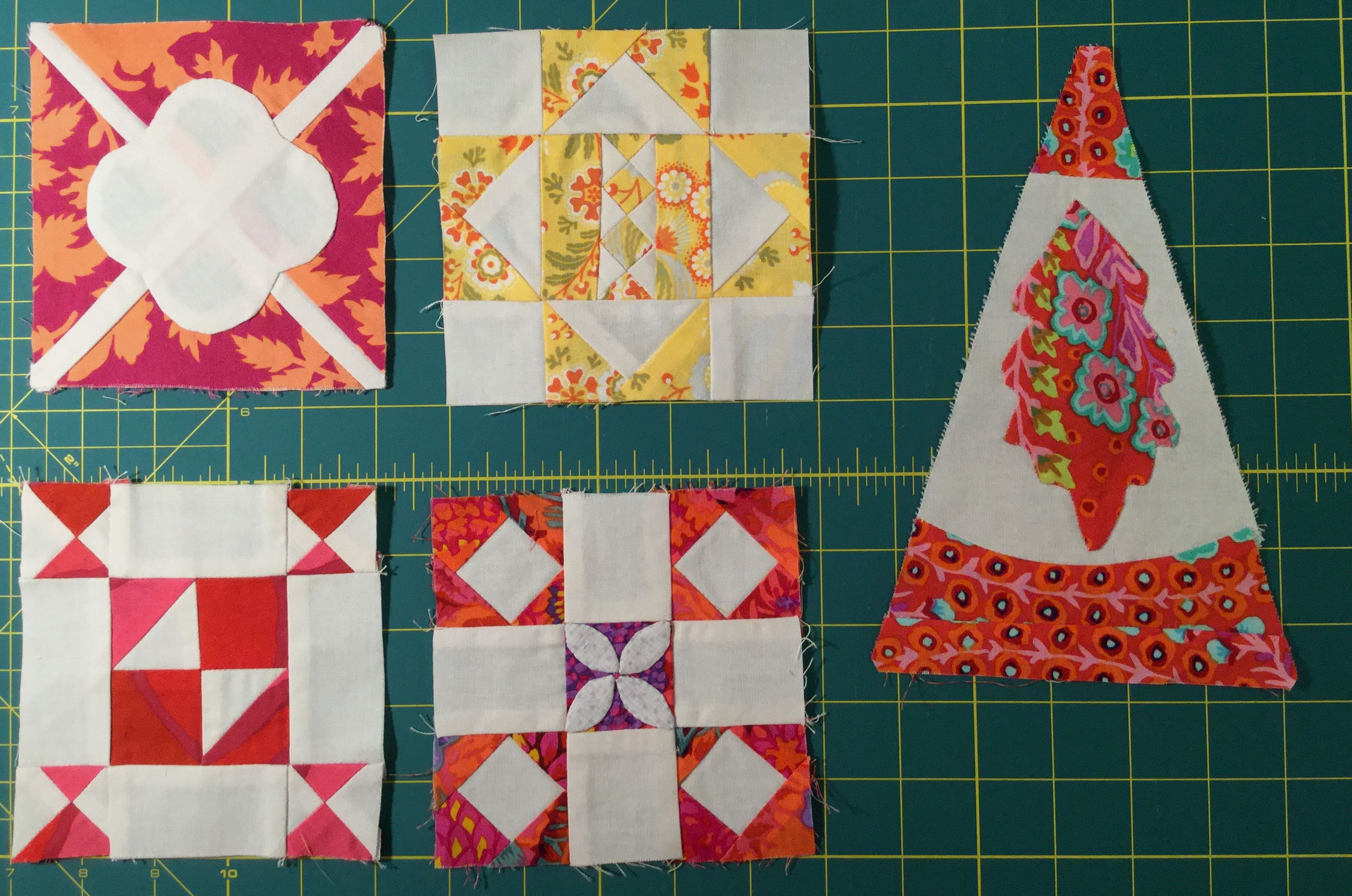 The goals was to have everything done in four years and I just knew that I could never catch up. Of course, I was considering continuing on at my own pace. Then I saw a Tula Pink City Sampler quilt on Pinterest with the Trellis sashing and I knew it was the perfect thing to do with my blocks. I came up with a design to use the exact number of blocks that I had completed. But, once I started playing with a color scheme it became obvious that I had too many green and red blocks. So I did end up making a few more blocks,