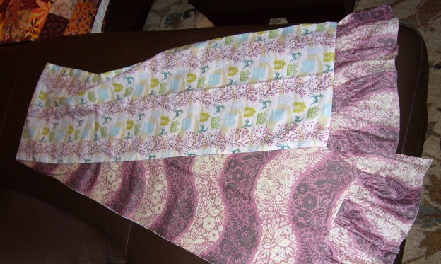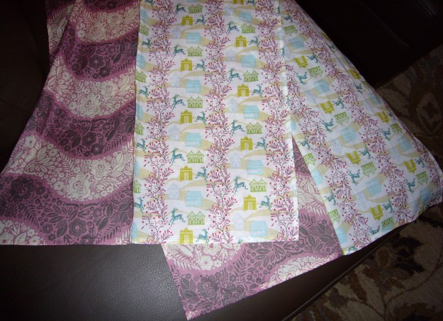 When I was in Nobleboro Maine this summer taking a Denyse Schmidt class at the Alewives shop I noticed their infinity scarf kits. They have a kit that uses the same fabrics as used in the velvet throw. They also offer a kit for a scarf made with two pieces of the cotton voile. I just love this fabric. It is very silky and the colors on the reverse of the fabric are nearly as sharp and bright as on the right side of the fabric. With this in mind I decided to make a more finite version of the scarf by sewing the two pieces of fabric down the middle with a French seam. This worked out very nicely! The scarf folds at the seam and wraps around your neck or ties in a nice knot. The trick is to do the French seam in reverse, so to speak. Start with the right sides together to get the scarf to fold down the middle and lie flat with the right sides up when finished. While it is true that you can’t notice the difference between the sides easily, there is a bit of a difference, so if you are particular you will want the right sides up!