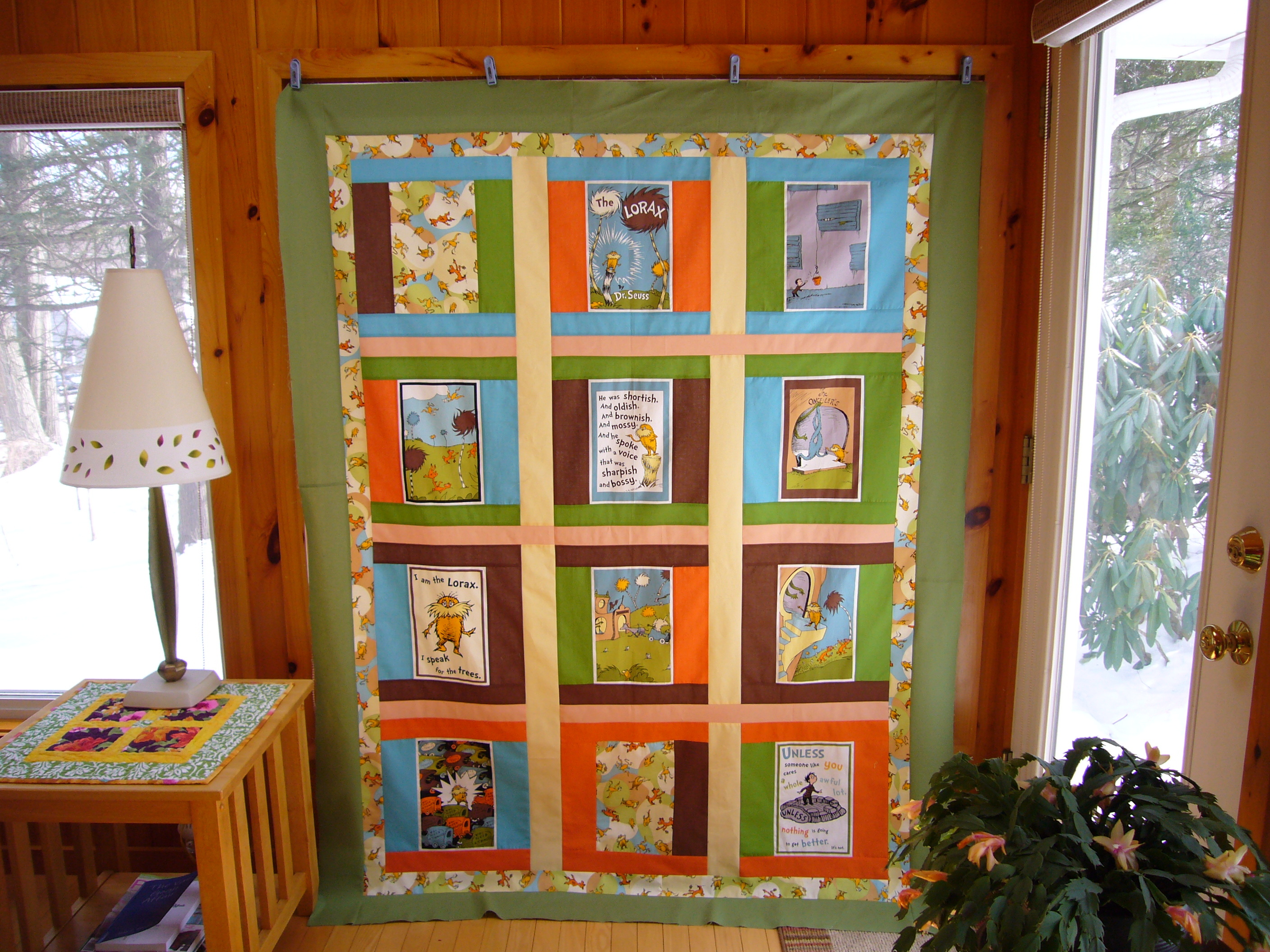 I suppose it is controversial to quilt right over the Lorax but I don’t think it matters to him. Think of it as a screen overlay and don’t worry about adding a panto over a panel.  I think it works just fine.
