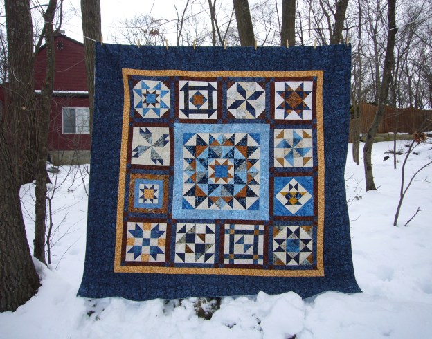 I finished my Midnight in Bali quilt top and have quilted it.  I used an edge to edge pantograph called Big Leaf which I think suits the batik fabrics.  I have taken photos of it, but I must admit that I still have not attached the binding!  I promise I will finish this quilt!  I have the binding cut out, but wanted to get outside and take photos in the snow before it melts … it is Spring, the snow must melt!