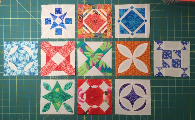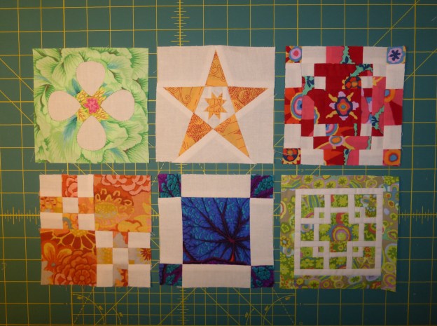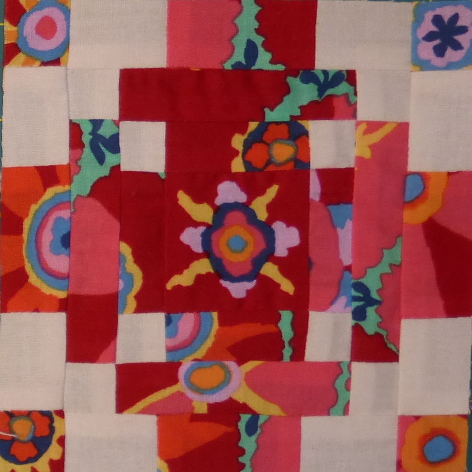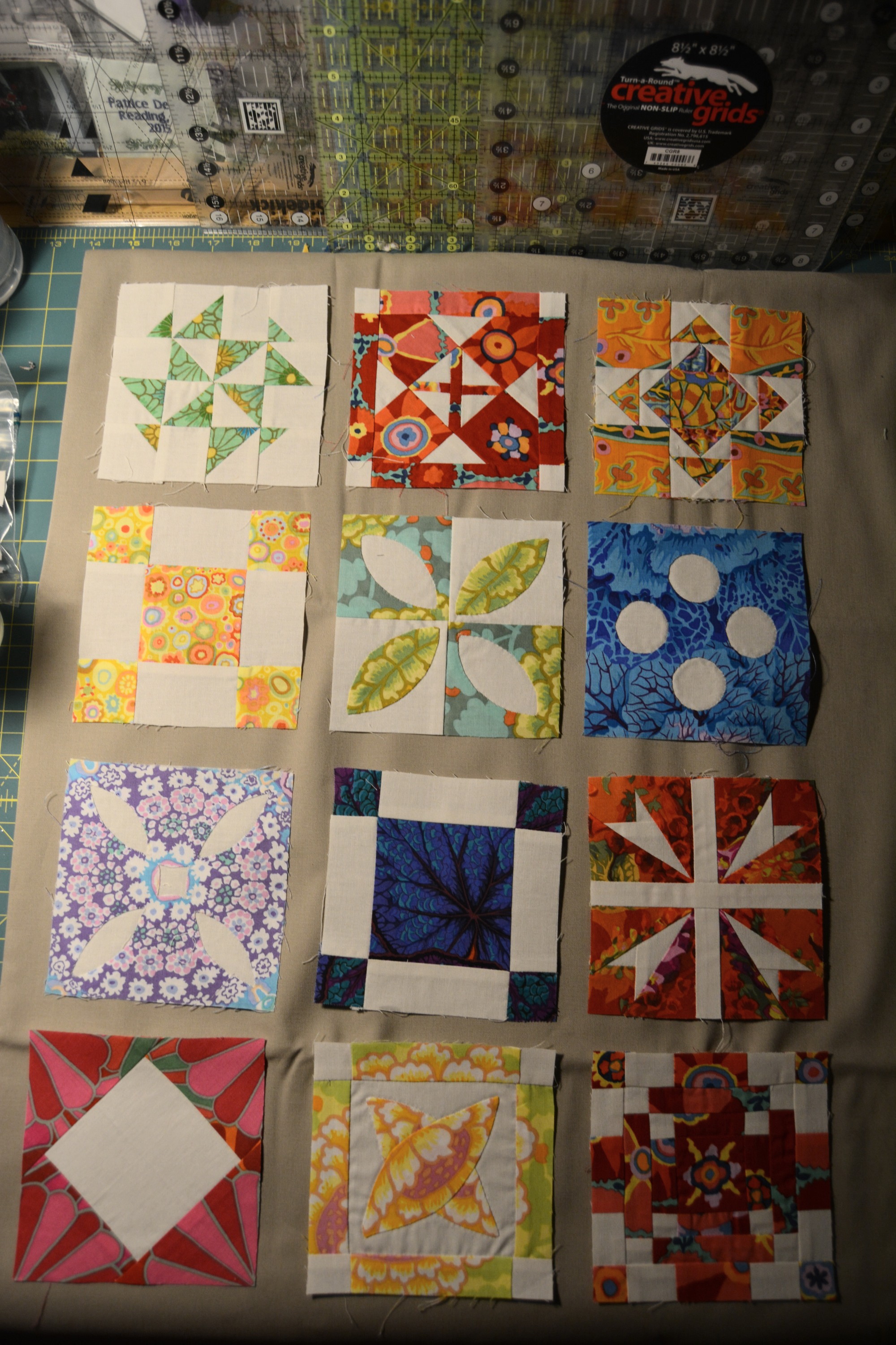 For example, I randomly chose Tetrad Blue. So, I made an improv quilt with two sets of complimentary colors: Blue/Orange and Red-Violet/Yellow-Green. The idea was to start with monochromatic blocks with different values of the colors and then mix them all together. The mixing proved too chaotic and I felt it was a non-harmonic clashing mess. So rather than merge it all together, I softened the look with negative space and came up with this: